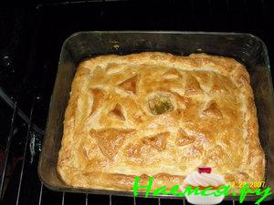 Сверху начинки выкладываем пласт теста и зашипываем с боковыми полосками теста по форме, чтобы у нас получился закрытый пирог( обязательно плотно защипать, иначе во время приготовления кулебяка порвется по швам и вытечет сок).