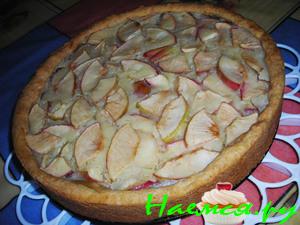 Выкладываем в форму тесто, соорудив бортики. Сверху высыпаем яблоки и заливаем всё сметанно-творожной смесью.