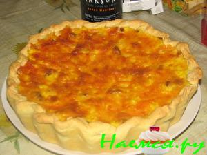 На готовое тесто выложить грибы с луком, залить смесью из яиц.