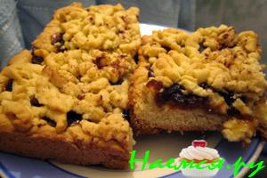 Затем одну часть (из холодильника) равномерно распредели по дну противня и смажь вареньем. А другую (из морозильника) натри поверх варенья на крупной терке.