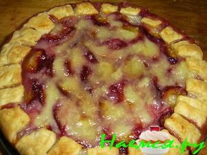 2. На противне, выстеленном бумагой для выпечки, сделать ободок из слив, внутрь залить тесто.