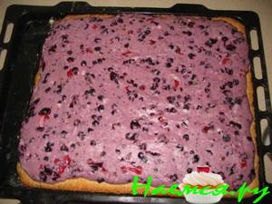 Форму выложить специальной бумагой,раскатать тесто,на него начинку,ягоды и посыпать посыпкой. Печь до готовности,200град