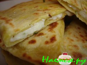 Когда начинка остынет, сформулируйте шарики и раскатайте лепешки (15см, диаметр) Смажьте поверхность маслом ( желательно топленым), и положите в центр каждой лепешки столовую ложку начинки. Плотно соедините края лепешки вверху (как мешочек). Присыпьте мукой и расплющите лепешку, как можно тоньше раскатайте её, но чтоб начинка не вылезла.