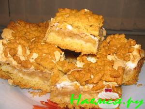 Достать форму с тестом из холодильника, поверх теста разложить яблоки, кто любит, можете посыпать корицей.