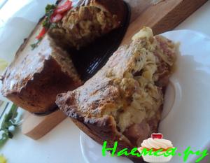 Нарезать кружочками лук и обжарить в сливочном масле 5 минут.Положить туда ветчину и снять с огня.Взбить яйца,посолить,добавить лук с ветчиной,сливки и половину натёртого сыра.
