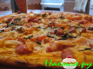 Тесто раскать по протвиню, по коржу размазать топленое масло и кетчуп. Выложить лук, колбасу, помидоры, зелень. Посыпать сыром и залить майонезом.