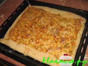 Берем пачку (250 гр) творога. Растираем творог и добавляем к нему 2 яйца, 4 столовые ложки растительного масла, 4 столовые ложки молока, пол чайной ложки соды, погашенной уксусом, сюда же постепенно всыпаем 2 стакана муки и щепотку соли. Тесто должно получится густое, при этом его желательно хорошенько размешать. Раскатать такое тесто вряд ли получится, его стоит выложить на предварительно посыпанный мукой противень и, постоянно смачивая руки водой или растительным маслом, равномерно распределить по всей площади противня. Пласт должен быть средней толщины (не стоит добиваться того, чтобы он был максимально тонким, как из дрожжевого теста). Далее стоит смазать тесто соусом (для этого я в равных долях смешиваю майонез и кетчуп, добавляя туда молотый черный перец либо другие приправы). Начинка для пиццы, как вы знаете, может быть самой разнообразной. В нашей семье есть несколько любимых начинок.