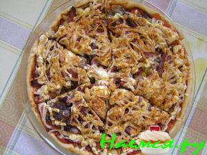 Раскатать тесто , смазать кетчупом , посыпать сыр ,орегано ,порезанные пластинками грибы , синий лук полукольцами , мелкие кубики перца болгарского , пополам порезанные черри и оливки.