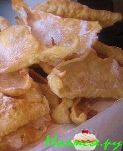 замесить тесто,тесто липкое я присыпаю мукой и раскатываю нарезаю беспорядочно на полоски ,потом делаю надрез в середине и один кончик просовываю через надрез,присыпаю мукой,жарю в растительном масле разогретом до золотистого цвета ,с двух сторон выкладываю на блюдо посыпаю пудрой сахарной,второй вариант смешала пудру с корицей и посыпала