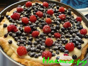 форму смазать сливочным маслом, выложить тесто, приподнимая края, чтобы тесто повторяло форму, сверху выложить ягоды.
