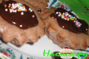 Формочки смазать маслом, 1 столовую ложку теста выложить в формочку затем положить кусочек шоколада и сверху еще ложку теста.