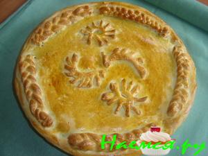 На середину круга распределяем начинку ,слепим края. На противень с пекарской бумагой ложим пирог швом вниз, по желанию делаем косичку и положим в длину пирога. Дадим пирогу немного «подняться», смажем желтком и выпекаем до румянности.