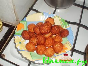 - Выкладываем пончики и обжариваем с обеих сторон на умеренном огне. Тесто начинаем подниматься и приобретать форму воздушного пончика.