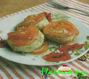 - На колбасе разложить кружочками помидоры. Посолить, поперчить.