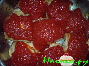 Сверху выкладываем паприку и лук,затем -порезанную колечками колбаску,посыпаем сыром и отправляем в духовку