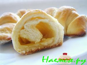Разделить тесто на одинаковые шарики- количество зависит от того , какого размера рогалики Вы хотите получить. Раскатать каждый шарик скалкой в овал толщиной 3 мм, на половину положить пластинку сыра, на другой половине сделать 3 продольных надреза, неразрезая тесто до конца. Свернуть в рулет не очень плотно, начиная со стороны с начинкой. Выложить швом вниз на противень, выстланный бумагой для выпечки, дать расстояться 15 мин., смазать взбитым с молоком и маслом яйцом. Выпекать в предварительно разогретой до 220 духовке 10-15 мин. Остудить на решетке.