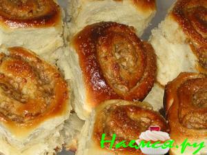 Скатать рулет, нарезать булочки толщиной 2-3 см, уложить их на противень смазанный маслом или выстеленный пергаментной бумагой. Немного примять и оставить еще на 20минут (лучше накрыть полотенцем.