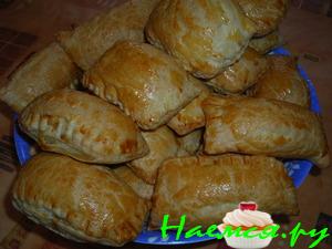 Тесто Разделить на равные части, раскатать толщиной в тонкий лист бумаги, должно получится формой в большой прямоугольник, с легка смазать маслом, разрезать на равные части шир. 10см. по вертикале, в нижнею часть теста, та что ближе к краю стола ложится начинка 1ст лож., заворачиваем (тесто+начинка) в право потом влево и так до конца таким образом формируем треугольник. Укладываем на предварительно смазанный маслом противень, выпекаем при средней темп. до золотистой корочки.