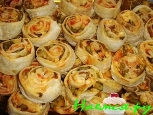 Уложить заготовки на смазанный маслом противень, смазать взбитыми желтками и запекать в разогретой до 180 градусов духовке 12-15 минут ( в зависимости от вредности Вашей духовки).