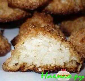 Кокос смешать с сахаром, белки взбить в крепкую пену. Порциями вводить белки в кокосовую смесь, каждый раз перемешивая. Должно получиться плотное и эластичное тесто. Вся порция белков не понадобится. Сформировать руками 15 пирамидок и выложить на смазанный противень и печь при 190 градусах 12-15 минут, пока верхушки не станут золотистыми.
