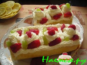 На теплый корж намазать начинку и свернуть рулет.(если корж остынет, он будет ломаться)