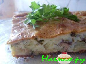 На тесто ровномерно раскладываем натёртый сырой картофель,затем нарезаный лук и размятые рыбные консервы.