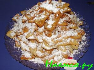 Разделанное тесто опускать в горячий жир, подготовленный из топленого масла с добавлением смальца или другого жира. Готовый хворост вынуть вилкой из жира на решето или на бумагу и посыпать сахаром, истолченным и смешанным с ванилином, цедрой или корицей.