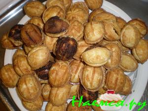 2.После выпечки орешков в "орещнице" наполняем их начинкой. В сгущёнку кладутся дроблённые орехи и "лишние" краюшки выпеченных орешков.