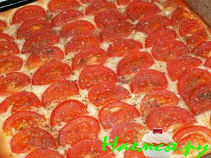 Противень выложить пергаментом, распределить вручную подошедшее тесто, распределить начинку. Полить остатками масла и посыпать приправами.