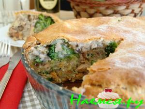 На стол высыпаем пригоршню муки раскатываем скалкой больший кусок теста и выстилаем им дно и борта формы для пирога (24см диаметром 5 см высотой) Поверх теста выкладываем начинку,Затем раскатываем меньший кусок теста и накрываем им начинку, края прокатываем скалкой и удаляем лишнее тесто.