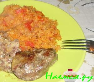 гусиную печень (или любую другую птичью)освободить от жилок, порезать небольшими кусочками, полить коньяком, оставить мариноваться минут 20-30.