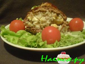 В фарш (350 гр. говядины,350 гр. свинины) добавляем смоченый в молоке хлебный мякиш,мелко нарезаный и обжаренный лук,натертый на мелкой терке ломтик сыра,соль, перец по вкусу.Добавляем одно сырое яйцо(немного желтка отложите в сторону).Всё перемешиваем до однородной массы.
