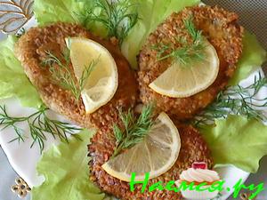 Обвалять в муке,обмакнуть в яйце,затем в сухарях и молотом грецким орехом.