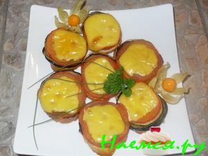 На ломтик баклажана кладем кружок помидора, сбрызгиваем уксусом, кладем листик базилика. Дальше размазываем 1-2ч.лож. сыра и накрываем кусочком рыбки. Скрепляем зубочисткой.