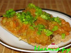 Все по отдельности обжарить на оливковом масле. И обязательно дать стечь маслу. Выложить на блюдо в таком порядке: кабачки- лук- морковь- болгарский перец- помидоры и сверху посыпать нарезанной зеленью . Дать остыть.