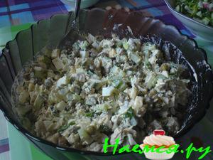 всё порезанное добавить в миску с домашним сыром, перемешать и добавить немного сметаны