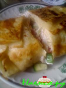 На лаваш в центр выкладываем грудку потом огурцы с помидорами, лук и поливаем соусом.