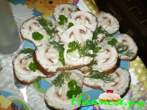 Поверх каждой гренки намазать майонез, положить ломтик гриба и маринованный лучек.