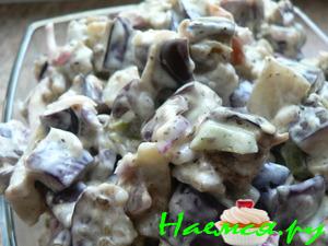 Баклажаны разрезают вдоль, снимают шкурку и режут кусочками, добавляют лук со специями, орехи, сахар и соль.