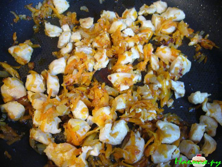 Натереть морковь на тертке, мясо и лук порезать кубиками, все слегка поджарить, затем тушить до готовности.