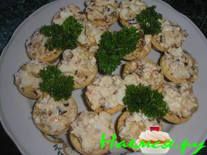 тарталетки начить начинками,и заморозить,перед приходом гостей духовку нагреть до 170гр,и 10 -15 подержать там.