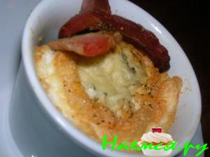 Белки взбить с солью в крутую пену, выложить в формочку, формируя гнездышко, посыпать сыром, в углубление положить два желтка.