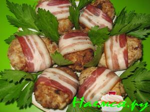 Готовые котлетки обернуть беконом,уложить на противень,запечь в духовке 5-8 минут.