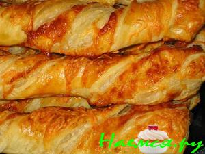 Разрезать тесто на полоски, свернуть рулетиками, поставить на смазанный маслом противень и в духовку на 180 гр до золотистого цвета.