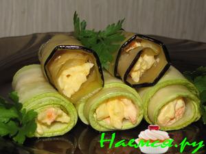 Кабачки обжариваем в кляре и выкладываем в форму для запикания, под каждый кабачек кладем кружок помидора (чтоб не вытекла начинка). В ту же форму кладем лодочки из баклажан.