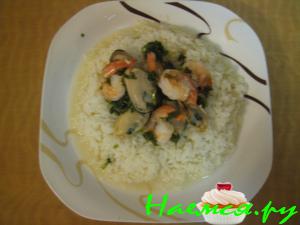 На сковороде разогреть 1ст.ложку растительного масла и примерно столько же сливочного, обжарить до золотистого цвета, влить 4-5ст.ложек томата(томатного сока, либо томатной пасты разведенной бульоном), добавить мидии, быстро довести до кипения, уменьшить огонь, накрыть крышкой и тушить минут 5-7 до загустения.
