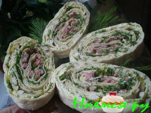 готовый рулет остудить,развернуть и нарезать на кусочки