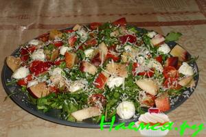 Помидоры порезать не до конца шириной 0,7-1,0 см. В полученные отверстия сбрызнуть немного масла, посыпать сухими травами, солью, перцем. Туда же воткнуть порезанную кольцами моцареллу. Все это выложить на вымытые и обсушенные листочки руколы. Сверху полить "бальзамико".