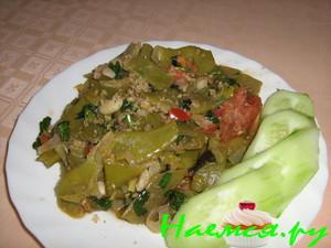 Лук нарезать кубиками,фасоль кусочками.Обжарить на растительном масле лук до золотистого цвета,добавить нарезанную фасоль влить воду,чтоб покрыла фасоль на половину.Тушить без крышки,до полного испарения воды. Фасоль должна стать горохового цвета,тогда добавляем фарш,очень хорошо перемешиваем,чтобы фарш был рассыпчатым.Тушить помешивая,до испарения жидкости,вбиваем яйца,солим,перчим,посыпаем специями и подаем на стол. Мы с мужем любим это блюдо как горячим,так и холодным.