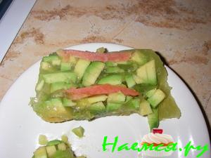 6. В прямоугольную формочку для террина постелить пищевую пленочку, затем на дно формы выкладывать несколько кусочков семги, потом слой авокадо. Чередовать слои, верхним должна быть рыба. Поставить в холодильник на несколько часов.